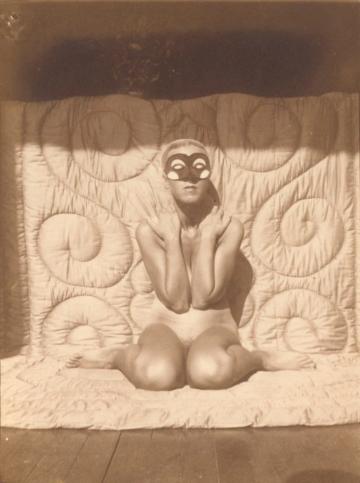 An early example of breaking the heteropatriarchy through self-portraiture is the feminist surrealist photographer Claude Cahun (1894-1954). Facing six months of Nazi imprisonment due to the possession of a camera and being sentenced to death for treason she turned to other art forms such as writing to express herself, but this doesn’t by any means diminish the photography she produced, referring to these many times in her writing. [12] Her work was made when dominant surrealistic photography in the early twentieth century heavily featured the prioritisation of the female nude, whereas her surreal self-portraiture presented herself as naked but never as “nude”. This was for the purpose of protecting herself from “voyeuristic consumption”.[13] In a time where it was so prevalent to see the sexualised image of a woman it was even more important to see representation of self-portraiture that turned away from the classic images based around male control, for example photographs produced by Man Ray as shown in figure 1. Photography during this period was often directly related to the objectification of women, even in a surrealistic format.